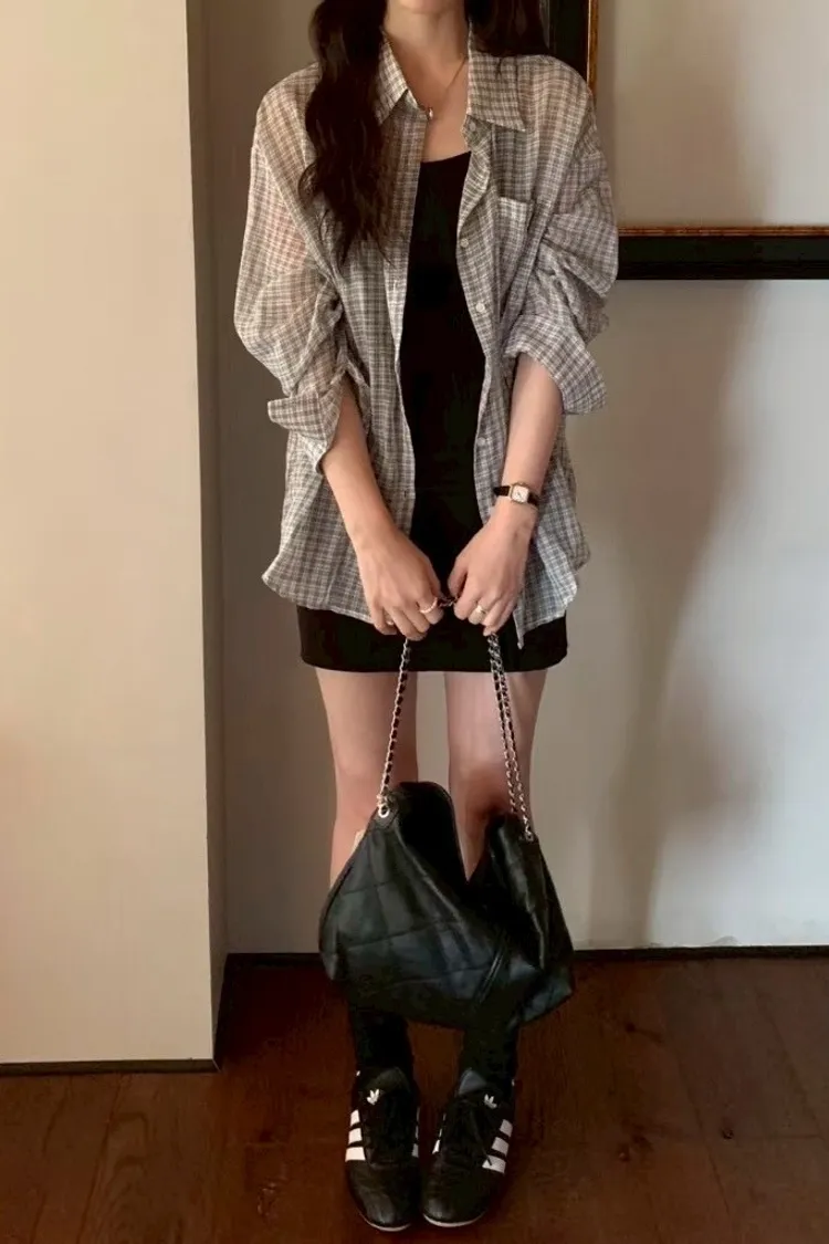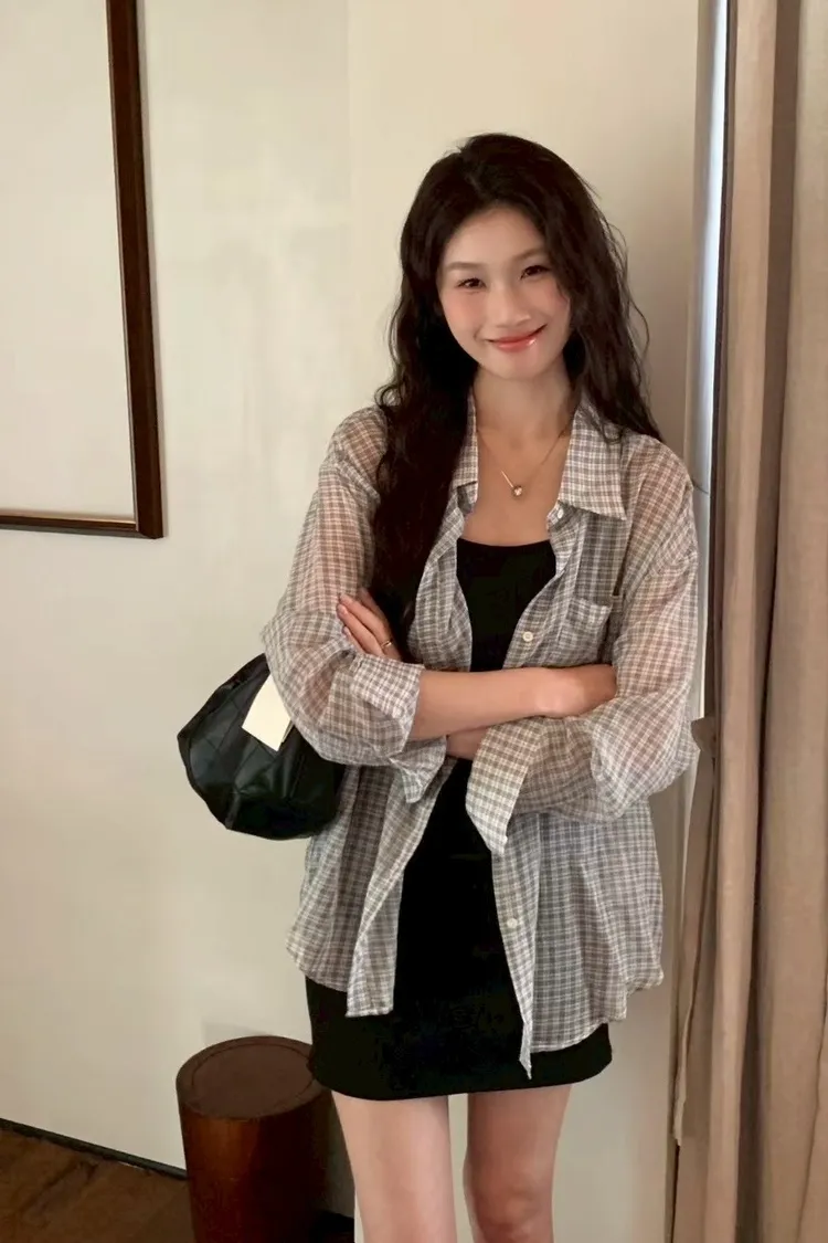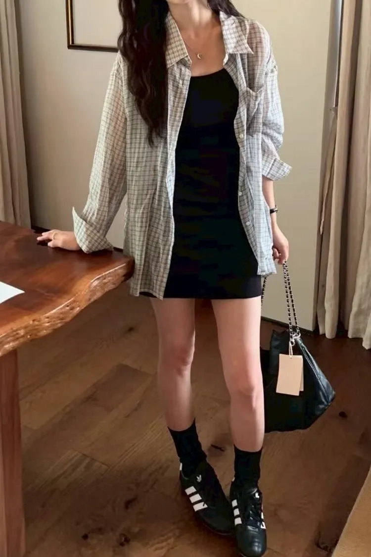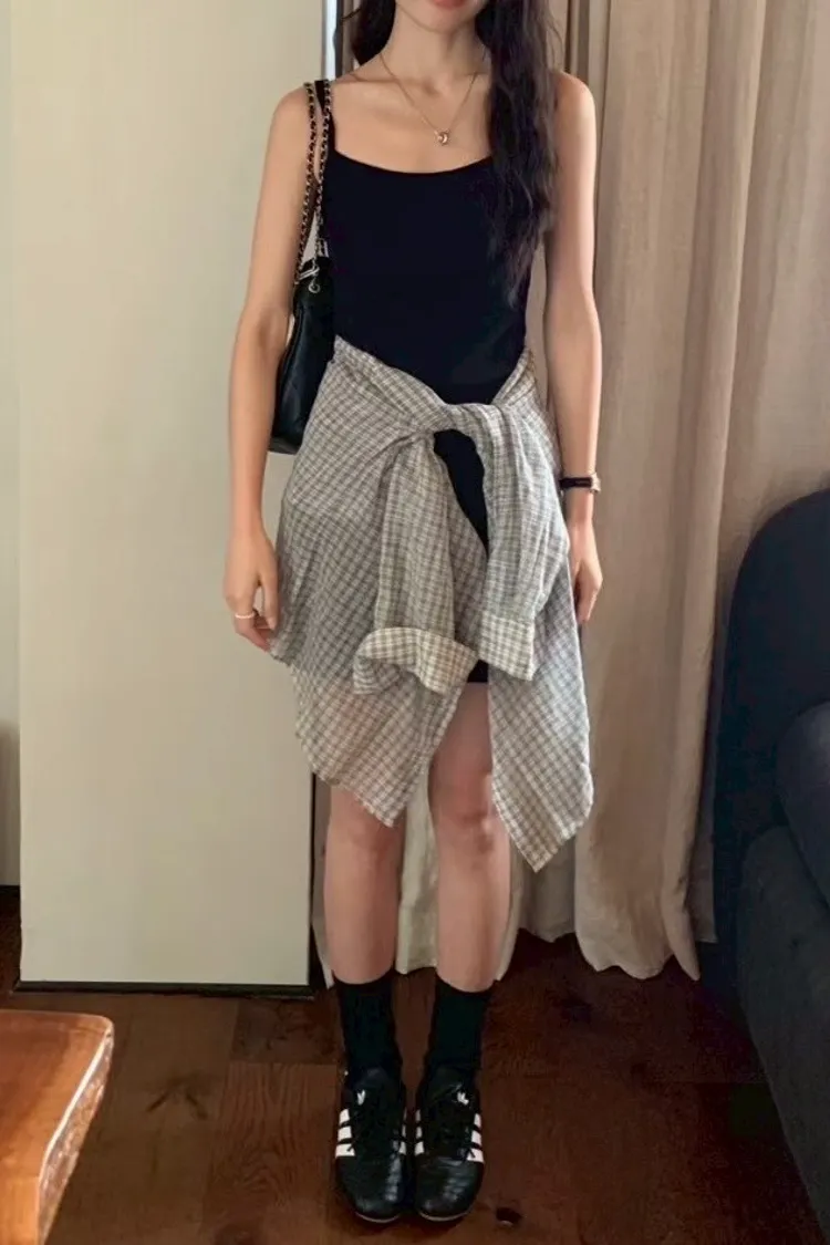 格子襯衫+細肩短洋