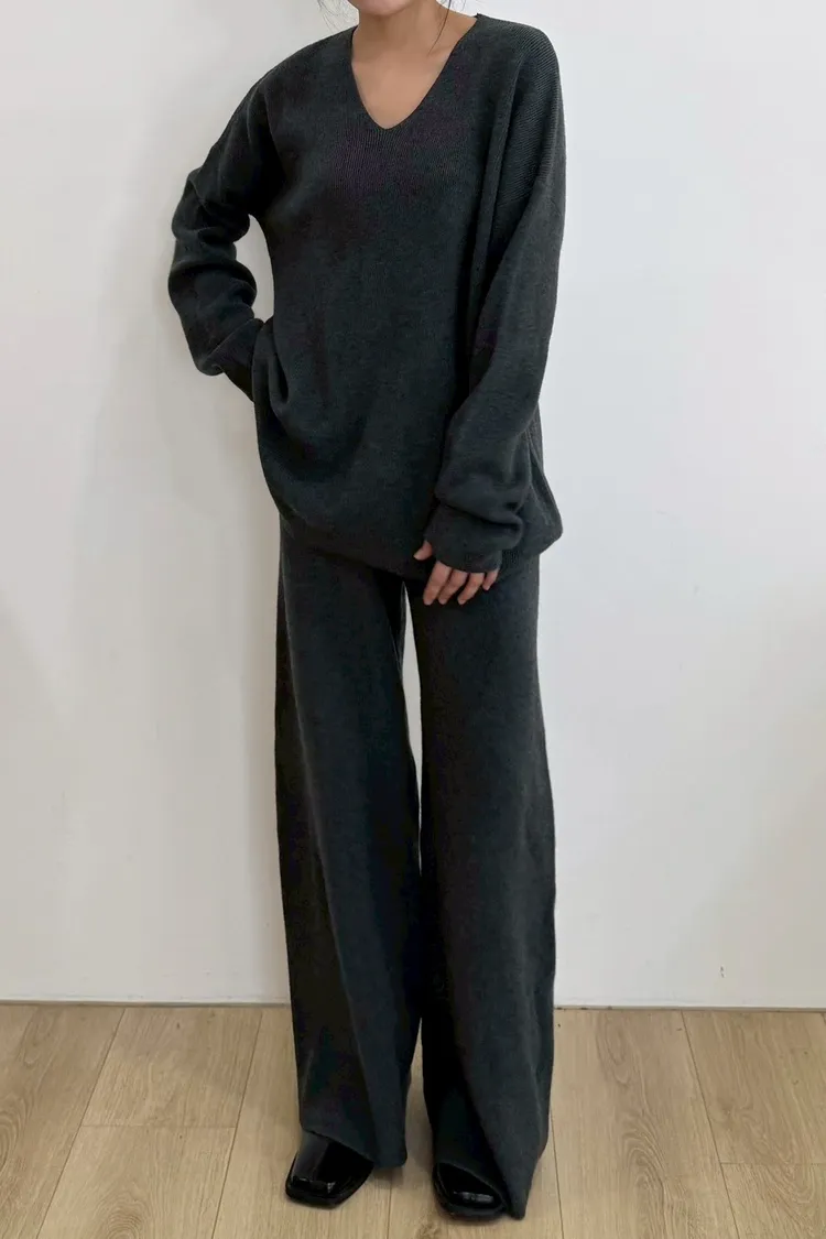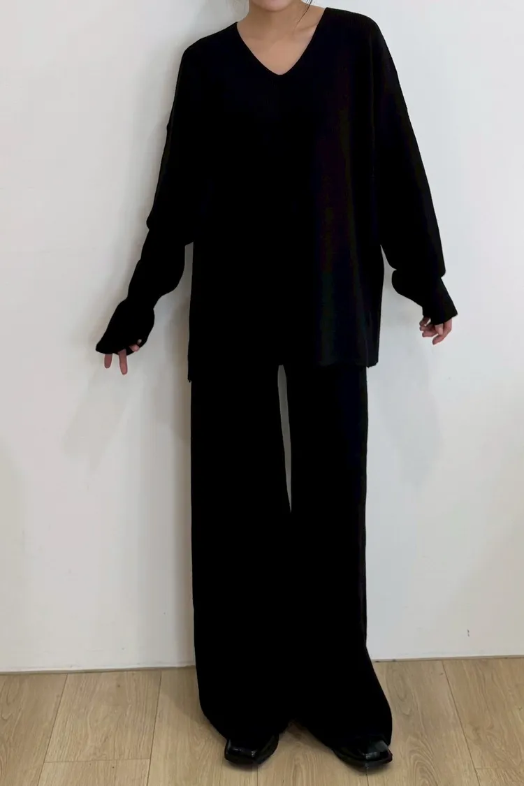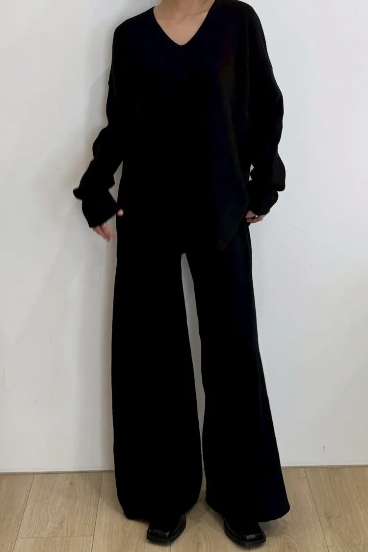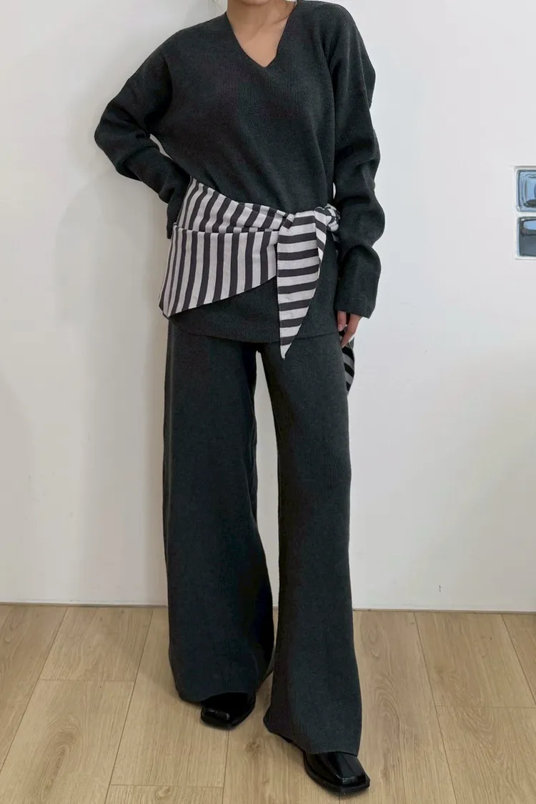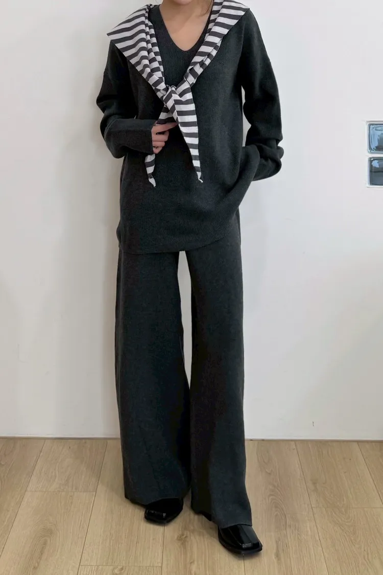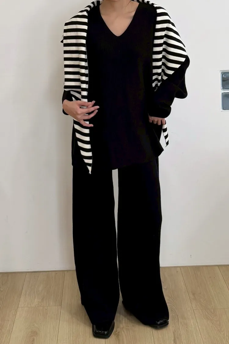 U領上衣+針織寬褲+條紋披肩