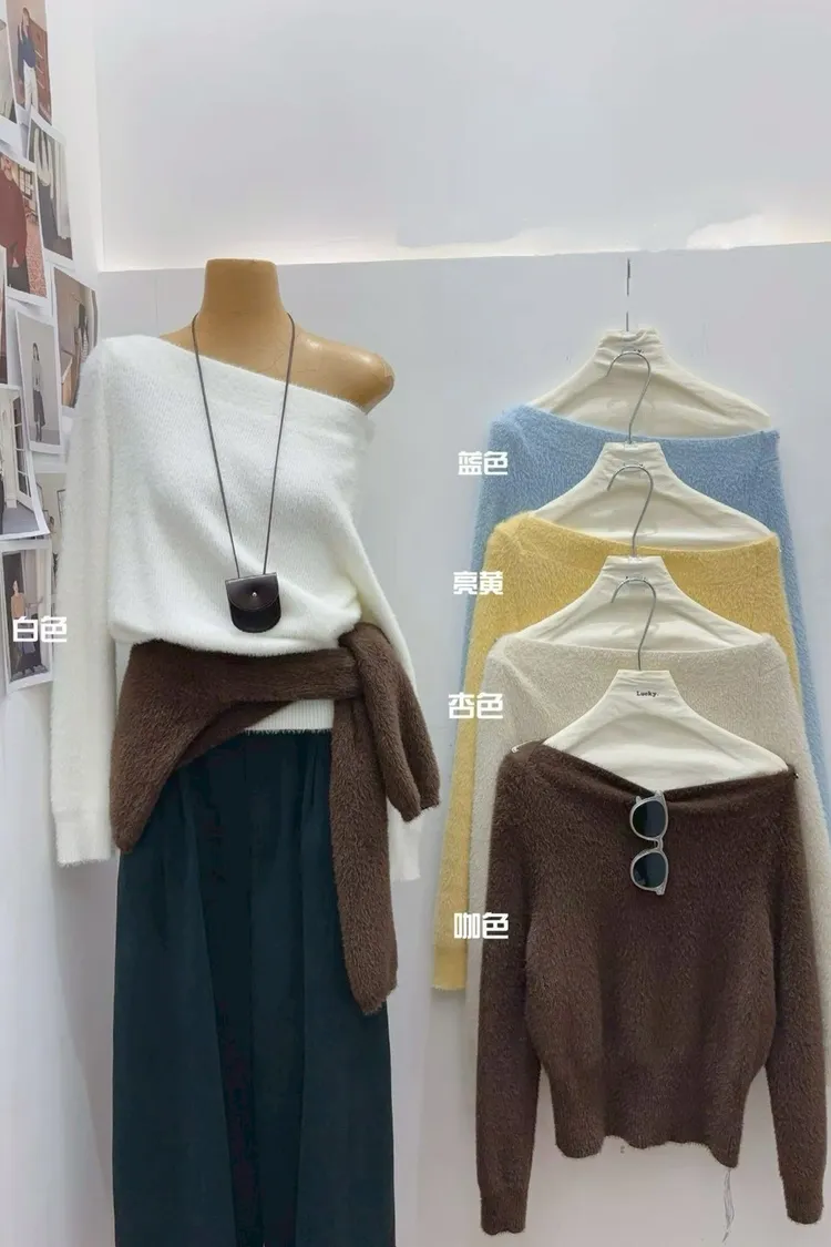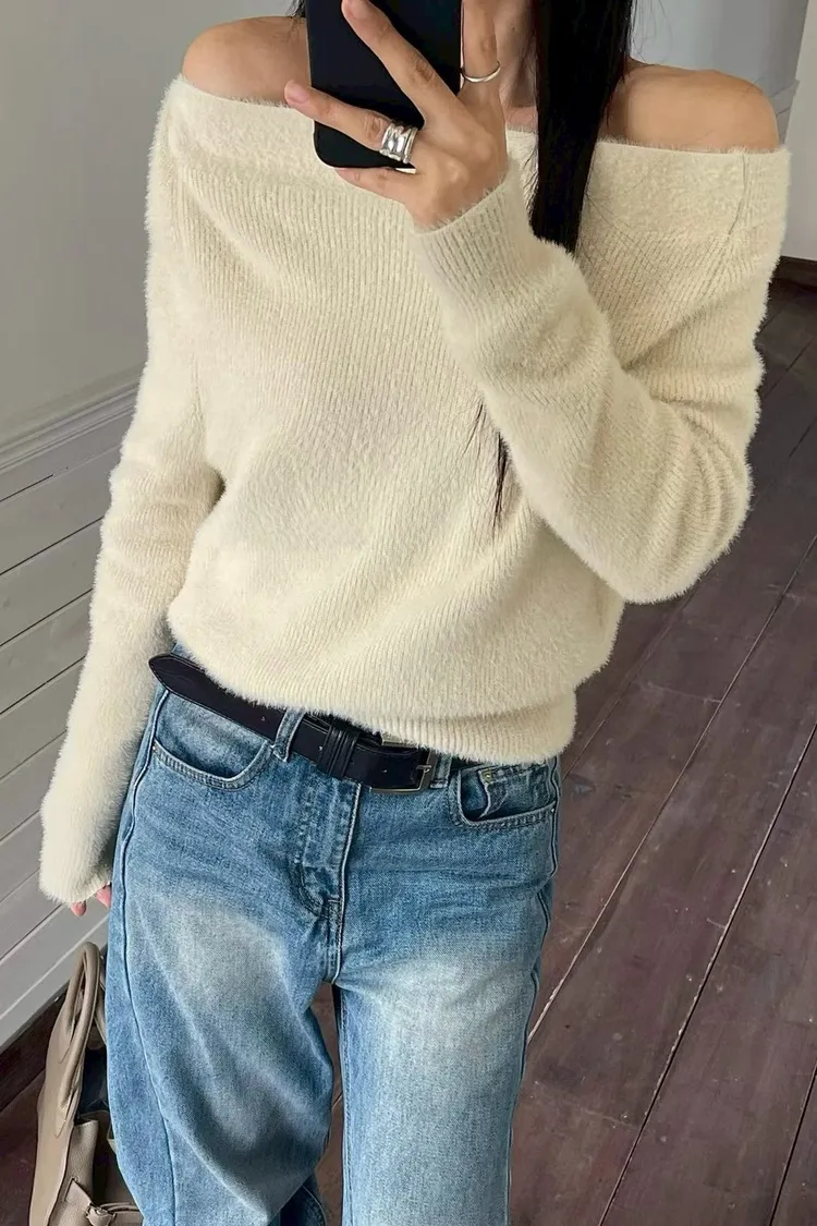 一字肩水貂毛上衣